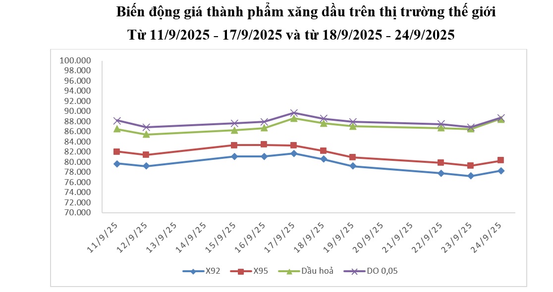 Bình quân giá thành phẩm xăng dầu thế giới giữa kỳ điều hành giá ngày 18/9/2025 và kỳ điều hành ngày 25/9/2025 là: 78,604 USD/thùng xăng RON92 dùng để pha chế xăng E5RON92; 80,474 USD/thùng xăng RON95; 87,274 USD/thùng dầu hỏa; 87,902 USD/thùng dầu điêzen 0,05S; 404,720 USD/tấn dầu mazut 180CST 3,5S.